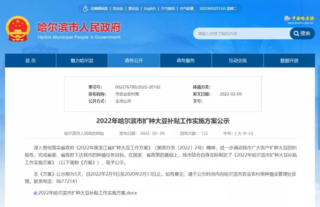 這不,假期剛過沒幾天,還沒有到正月十五,兩則關(guān)注2022年黑龍江省糧補(bǔ)特別是大豆補(bǔ)貼的官方文件——《黑龍江省人民政府辦公廳關(guān)于印發(fā)2022年黑龍江省擴(kuò)種大豆方案的通知》、《2022年哈爾濱市擴(kuò)種大豆補(bǔ)貼工作實(shí)施方案公示》已經(jīng)傳出。